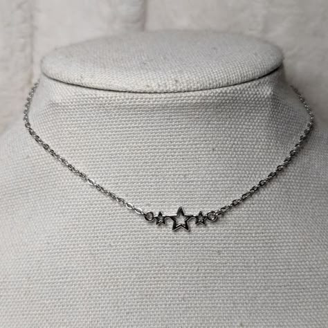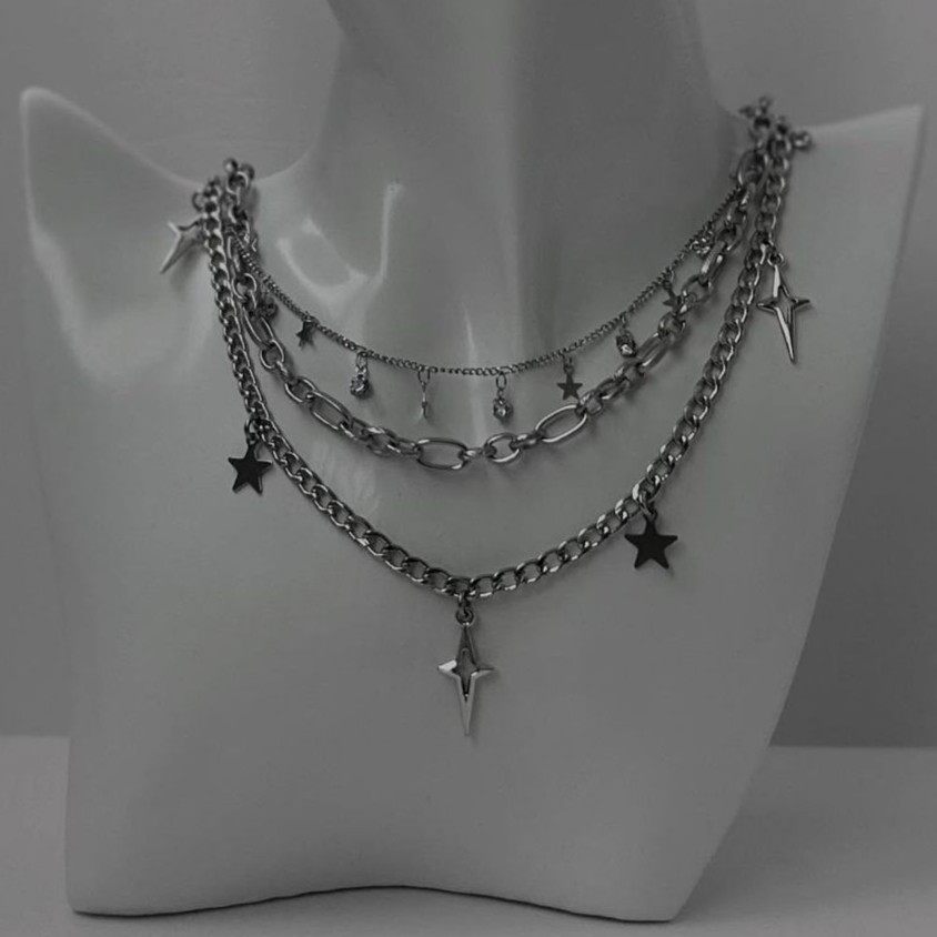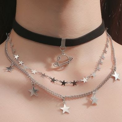 Pack 3 piezas gargantilla dije de saturno, collar con miniestrellas y cadena con estrellas. Acero inoxidable